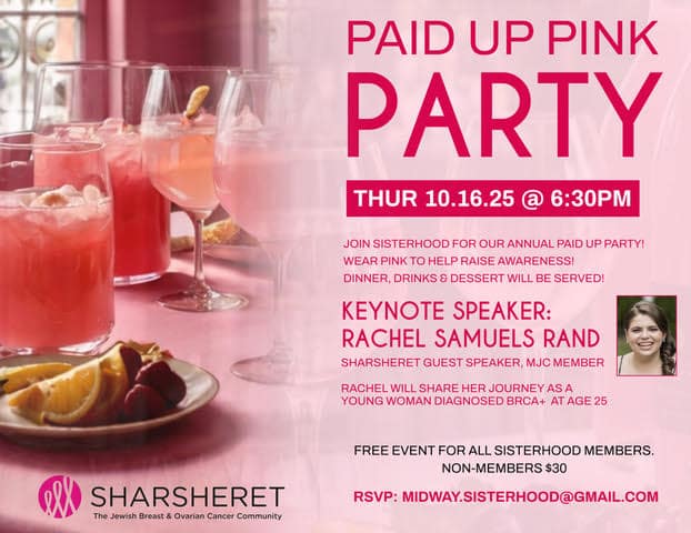 Sharsheret is proud to partner with the Sisterhood at Midway Jewish Center for their Annual Paid Up Pink Party. The evening will include dinner, drinks, and dessert, with participants wearing pink to help raise awareness. The program will feature keynote speaker Rachel Samuels Rand, who will share her inspiring journey as a young woman diagnosed with breast cancer.