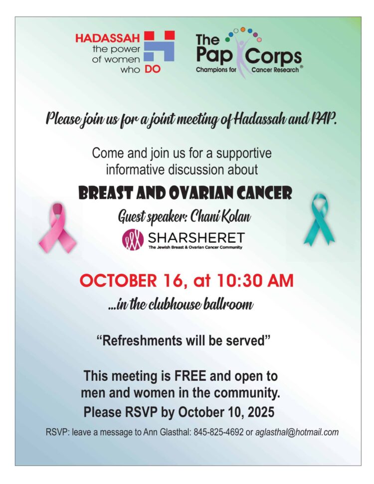 Join us for a special joint meeting of Hadassah and The PAP Corps for a supportive and informative discussion on Breast and Ovarian Cancer & Creating a Caring Community.