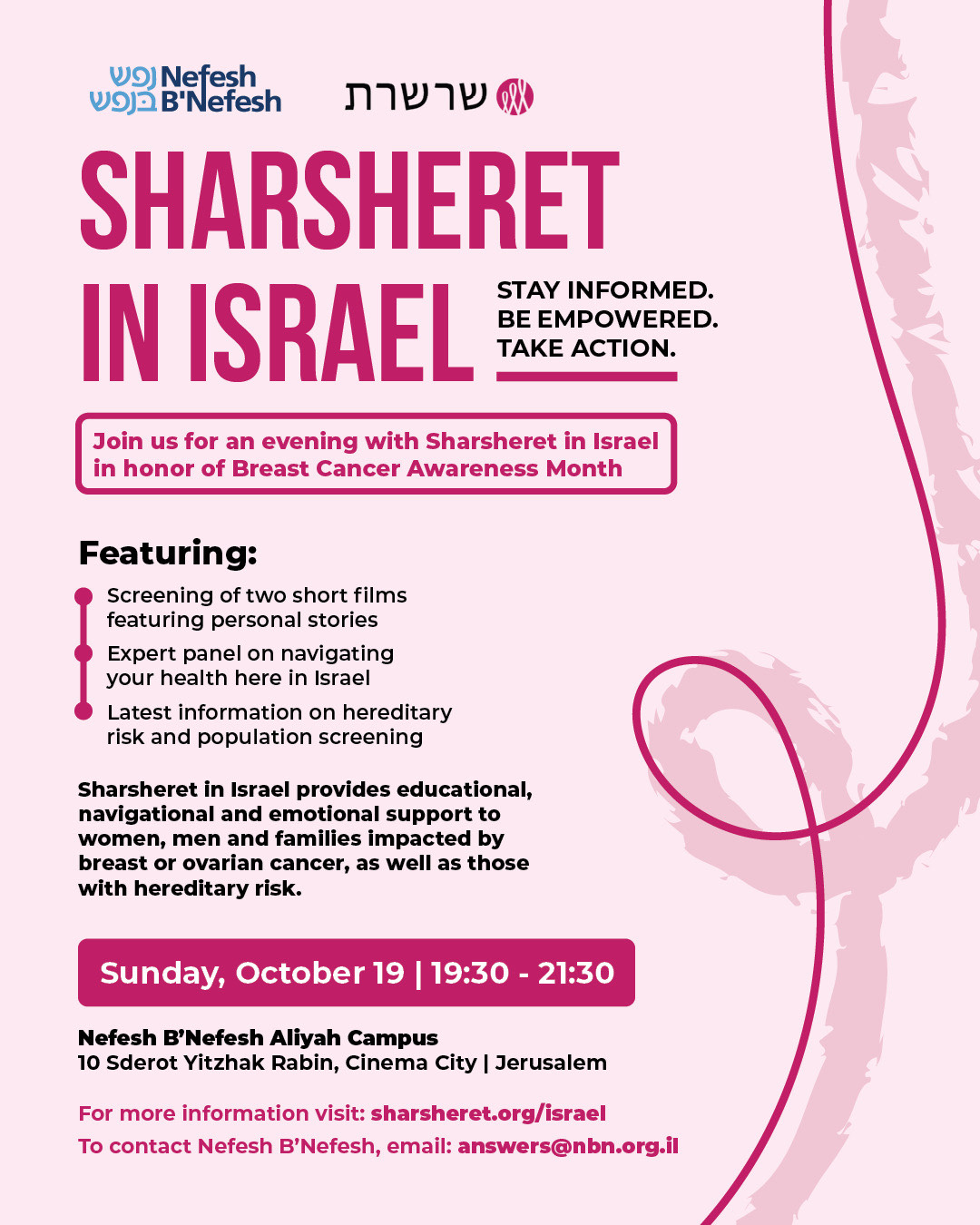 Join us for an evening with Sharsheret in Israel in honor of Breast Cancer Awareness Month.