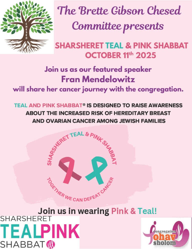 Join Sharsheret and the Brette Gibson Chesed Committee at Congregation Ohav Shalom for a meaningful Teal and Pink Shabbat featuring Sharsheret speaker Fran Mendelowitz. Together, we’ll raise awareness about the increased risk of hereditary breast and ovarian cancer in Jewish families. Remember to wear your pink and teal. We look forward to seeing you there!