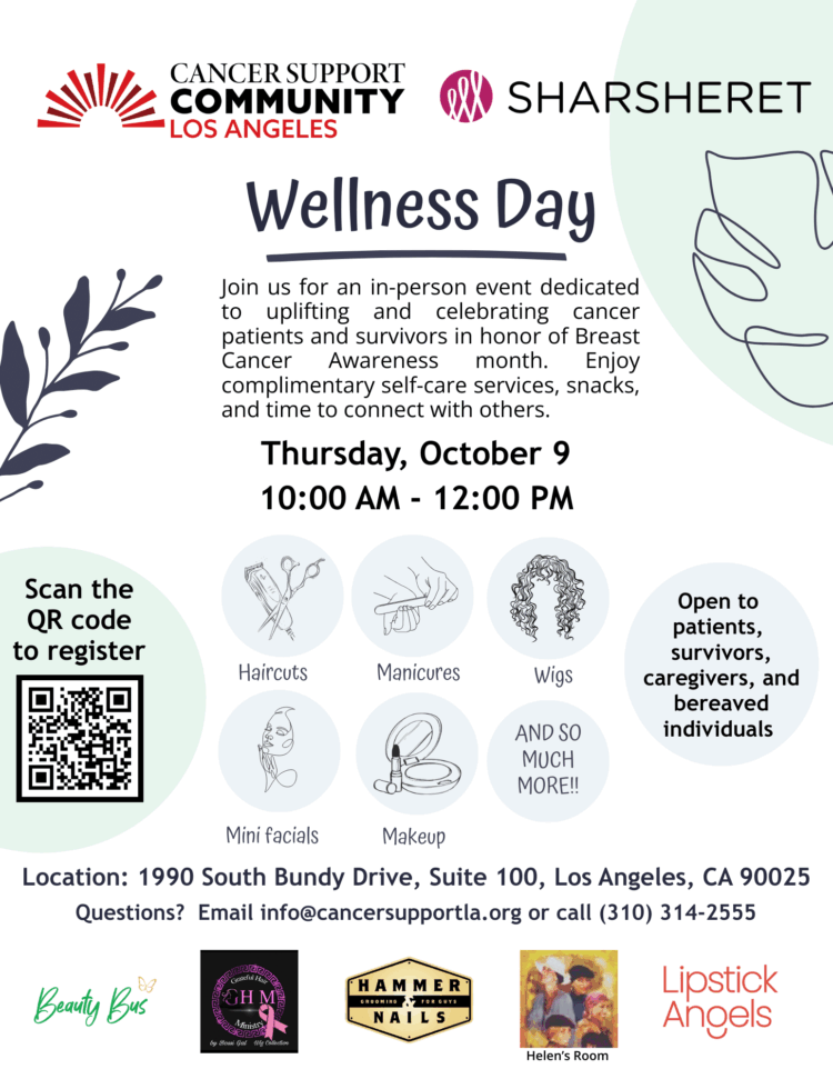 CSCLA and Sharsheret are hosting a special in-person Wellness Day—a two-hour event dedicated to uplifting and celebrating cancer patients and survivors on Thursday, October 9, in honor of Breast Cancer Awareness month. The event will feature activities that promote healing, self-care, and empowerment